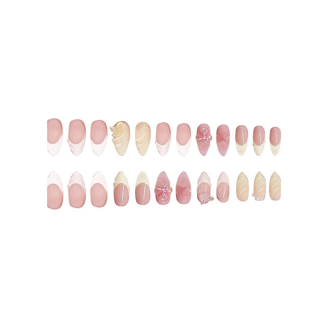 24Pcs Sweet Cool Almond Nail Set Press on Acrylic Nails 3D Floral Butterfly Fake Nail Full Cover French Tip Artificial Nails Art